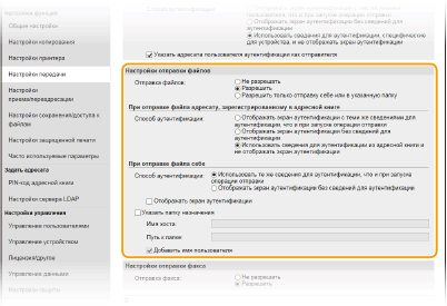 Если для параметра [Отправка файлов] задано значение [Разрешить]