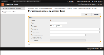 С помощью компьютера можно регистрировать адресатов в адресной книге аппарата или редактировать зарегистрированных адресатов. Укажите здесь общую папку или пункт назначения на FTP-сервере.