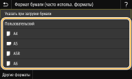 После регистрации параметра бумаги по умолчанию экран параметров бумаги не отображается при загрузки бумаги и всегда используется один и тот же параметр. Если загрузить другой размер или тип бумаги без изменения параметров бумаги, аппарат может не печатать надлежащим образом. Во избежание этой проблемы выберите <Указать при загрузке бумаги> на шаге 3, затем загрузите бумагу.