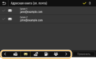 Если адресат выбирается в пункте <Адресная книга> на экране Главный, экран основных функций для отправки по электронной почте или сохранения файла может открыться во время задания выбранного адресата.