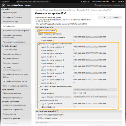 Выбор настроек на панели управленияПараметры IPv6 также можно настроить через <Меню> экрана Главный. <Настройки IPv6>