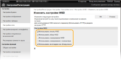 Установите флажок, чтобы разрешить печать по протоколу WSD. Если печать по протоколу WSD не используется, снимите флажок. [Использовать обзор WSD]
