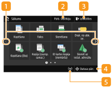<Statusa pārr.>Nospiediet, lai pārbaudītu drukāšanas statusu, skatītu lietojuma vēsturi vai dažādus tīkla iestatījumus, piemēram, iekārtas IP adresi. Varat arī skatīt iekārtas statusu, piemēram, atlikušo papīra daudzumu un tonera daudzumu kasetnēs, kā arī to, vai radušās kļūdas. Ekrāns <Statusa pārraudzība>