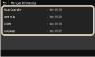 Programinės aparatinės įrangos versiją galima patikrinti naudojant aparato valdymo pultą. Kai bus baigta programinės aparatinės įrangos naujinimo operacija įsitikinkite, kad naujinimas buvo atliktas tinkamai. Programinės aparatinės įrangos versijos tikrinimas
