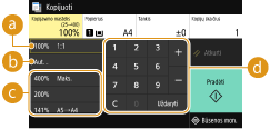 Galima padidinti arba sumažinti kopijas naudojant iš anksto nustatytą kopijavimo mastelį, pvz., <A5->A4>, arba nustatyti pasirinktinį kopijavimo mastelį 1 % žingsniais.