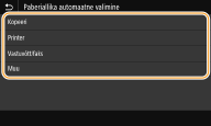 Saate iga paberiallika jaoks kas lubada või keelata paberiallika automaatse valimise funktsiooni. Kui funktsioon on seatud olekusse <Sees>, valib seade iga printimistöö korral automaatselt paberiallika, kuhu on asetatud sobiva suurusega paber. Kui valitud paberiallikas on paber otsa saanud, võimaldab funktsioon printimist katkematult jätkata, lülitudes ümber teisele paberiallikale, kuhu on asetatud sama suurusega paber.