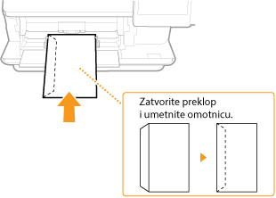 Omotnice Monarch, COM10, DL ili ISO-C5 umetnite okomito (tako da je kratak rub okrenut prema uređaju) i tako da je strana bez ljepila (prednja strana) okrenuta prema gore. Ne možete ispisivati na stražnjoj strani omotnica.