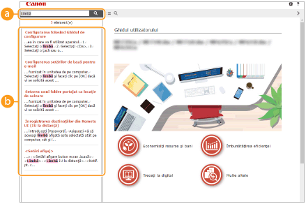 Faceţi clic pe  pentru a afişa fereastra de căutare. Conţine o casetă text pentru a efectua o căutare după cuvinte cheie şi pentru a găsi pagina pe care o căutaţi.
