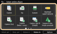Puteţi adăuga butoane pentru comenzi rapide la ecranul Pornire pentru funcţii utilizate frecvent, cum ar fi <Copiere>, <Fax> şi <Scanare>. De exemplu, puteţi efectua activităţi mai rapid şi mai eficient prin atribuirea unei secvenţe de setări (de ex., „Scanaţi ambele părţi ale unui document original, salvaţi-l ca fişier PDF comprimat şi trimiteţi-l prin e-mail”) la un singur buton.