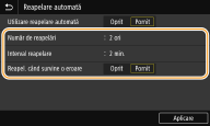 Selectaţi <Pornit> în <Utilizare reapelare automată>