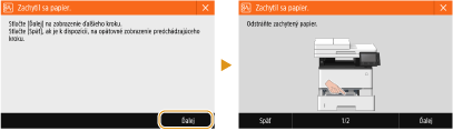 V niektorých prípadoch sa pri výskyte chyby zobrazia pokyny, čo máte robiť pri chybe. Problém vyriešite na obrazovke opísaným postupom. Nižšie je ako príklad zobrazená obrazovka, ktoré sa zobrazí pri zaseknutí papiera.