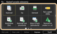 Môžete pridať tlačidlá skratiek na obrazovku Domov pre často používané funkcie, ako je <Kopírovať>, <Fax> a <Skenovať>. Napríklad môžete vykonávať úlohy rýchlejšie a efektívnejšie priradením sekvencie nastavení (napríklad Skenovať obe strany originálu, uložiť ich ako vysoko skomprimovaný súbor PDF a odoslať ho e-mailom) jednému tlačidlu.