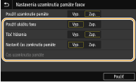 Špecifikujte, či sa má aktivovať funkcia Príjem do pamäte len počas špecifikovaného časového rámca dňa. Vyberte položku <Zap.>, aby sa aktivovala funkcia Príjem do pamäte len počas časového rámca dňa špecifikovaného v ponuke <Čas uzamknutia pamäte>.