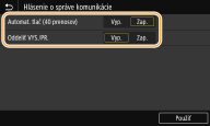 Výberom položky <Zap.> vytlačíte hlásenie automaticky vždy po 40 prenosoch alebo vyberte položku <Vyp.>, ak nechcete, aby sa tlačili hlásenia automaticky.