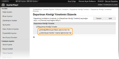 Bilgisayardan Yapılan İşler için Departman Kimliği Yönetimini Etkinleştirme). Ancak bu ayar için onay kutusu seçilmişse, kimlik ve PIN girilmeden de işler yürütülebilir. Doğru departman kimliği ve PIN girilmediği sürece hiçbir işin yürütülmemesi sağlayacak bir ayar yapılandırmak istiyorsanız, onay kutusunu temizleyin.