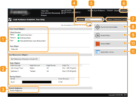 Uzak Kullanıcı Arabiriminde oturum açtığınızda, aşağıdaki Portal sayfası görüntülenir. Bu bölümde, Portal sayfasında görüntülenen öğeler ve temel işlemler açıklanmaktadır.