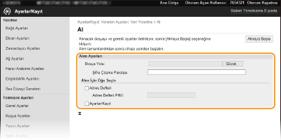 [Adres Defteri (ABK)] onay kutusu seçiliyse, Adres Defteri verileriyle makinenin ayarlarını aynı anda dışarı aktaramazsınız.