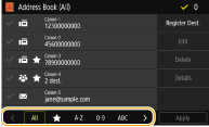 Адресатів, які часто використовуються під час сканування та надсилання факсів, можна зареєструвати в адресній книзі, щоб за потреби швидко їх знаходити (Реєстрація адресатів в адресній книзі). Адресатів можна шукати в алфавітному порядку, у списках адресної книги або введенням тризначних чисел (кодів кодованого набору). Указувати адресатів можна ще швидше, використовуючи наведені нижче функції.
