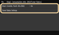 Якщо не потрібно використовувати параметр стану тонера, виберіть значення <Off>. Щоб кнопка, яка спрямовує на сайти для придбання картриджів із тонером, не відображалася на екрані Toner Status (Стан тонера), виберіть значення <On>, а тоді — <Off>.