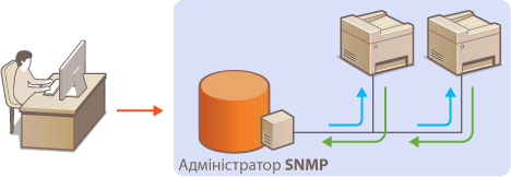 Програмне забезпечення для керування протоколом SNMP, інстальоване на комп’ютері в мережі, дає змогу за допомогою комп’ютера віддалено налаштовувати, відстежувати апарат і керувати ним. Для отримання докладнішої інформації див. посібники з експлуатації програмного забезпечення для керування.
