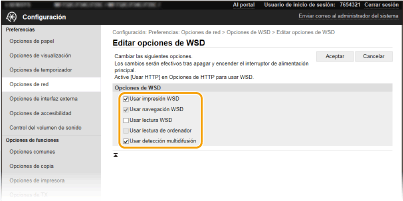 Marque la casilla de verificación para utilizar el escaneado WSD en el equipo con el panel de control. Esta casilla de verificación únicamente podrá seleccionarse cuando esté marcada la casilla de verificación [Usar lectura WSD]. Para realizar el escaneado, seleccione <Lectura> en la pantalla Inicio y especifique un ordenador conectado con WSD como destino de escaneado (Escaneado y guardado en un ordenador). [Usar detección multidifusión]