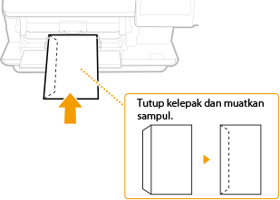 Muatkan sampul Monarch, COM10, DL atau ISO-C5 dalam orientasi potret (dengan sisi pendek menghadap ke mesin), dengan muka yang tidak digamkan (muka depan) menghadap ke atas. Anda tidak boleh mencetak pada muka belakang sampul.