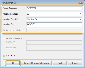 Tetapkan mod komunikasi dan nombor faks (atau URI) dan klik [OK].