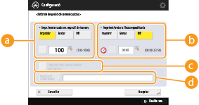 No podeu configurar els paràmetres de l'Informe de gestió de comunicacions mentre <Mostrar registre de treballs> a <Opcions de gestió> està establert en <Off>. A més, si canvieu <Mostrar registre de treballs> a <Opcions de gestió> de <Off> a <On>, <Impr./enviar cada nre. especif. de transm.> i <Imprimir/enviar a l'hora especificada> a l'Informe de gestió de comunicacions canvia automàticament a <Off>.