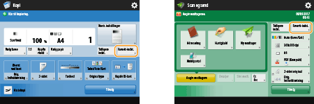 Du kan ændre de indstillingsknapper, der vises på skærmbillederne Grundlæggende funktioner (til kopiering, faxning og scanning). Du kan også vise et andet skærmbillede for grundlæggende funktioner, der er tilpasset hver enkelt bruger, der er logget på.