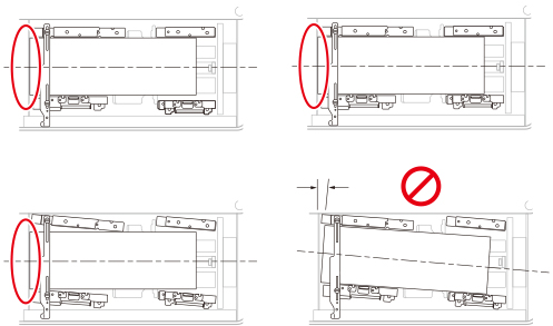 ![]() 请正确调整尺寸更改板(外侧和内侧)和后限位挡板,以免卡纸、弄脏打印件或弄脏本机内部。