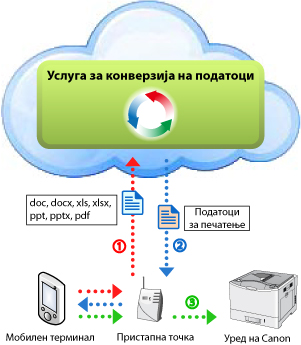 Со користење на Data Conversion Service се поврзувате на сервер на интернет кој ги конвертира податоците. Во зависност од содржината на податоците што сакате да ги печатите и опкружувањето за комуникација што го користите, поставувањето и преземањето на податоците може да потрае неколку минути.
