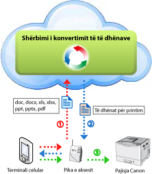 Përdorimi i Data Conversion Service ju lidh me një server në internet që konverton të dhënat. Në varësi të përmbajtjes të të dhënave që do të printohen dhe mjedisit të komunikimit që po përdorni, ngarkimi dhe shkarkimi i të dhënave mund të zgjatë disa minuta secili.