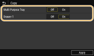 Always specify <On> for at least one of the paper drawers. If you select <Off> for all the drawers, then you cannot finish the setting procedure.