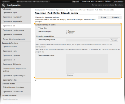 Si las direcciones IP se introducen de forma incorrecta, es posible que no pueda acceder al equipo desde la IU Remota, en cuyo caso deberá establecer <Filtro de direcciones IPv4> o <Filtro de direcciones IPv6> en<Off>.