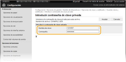 [Contraseña] Introduzca caracteres alfanuméricos para la contraseña de la clave privada establecida en el archivo que va a registrar.
