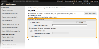Cargue (importe) los datos exportados desde el equipo. También puede importar opciones del equipo desde otro equipo al suyo si son del mismo modelo.
