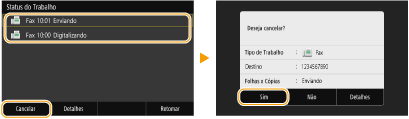 <Monitor Status>  <Trabalho de TX> Selecione o documento na guia <Status do Trabalho TX>  <Cancelar> <Sim>