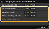 Especifique se deseja ativar a função de Recepção na memória apenas durante um período específico do dia. Selecione <Ativado> para ativar a função de Recepção na memória apenas durante um período especificado em <Hora de Bloqueio de Memória>.