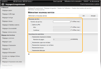 [Fonctions de restriction] Vous pouvez limiter le nombre de pages à imprimer et les fonctions accessibles aux services. Pour limiter le nombre de pages à imprimer, cochez la case associée au type souhaité et saisissez le nombre de pages approprié dans [Nombre de pages]. Cochez les cases des fonctions dont vous souhaitez restreindre l'accès.