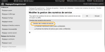Si la case est cochée, vous pouvez sélectionner <Ordinateur> ou <Scanner distant> sur l'écran principal et numériser des documents depuis un ordinateur à tout moment. Si la case n'est pas cochée, vous ne pouvez pas numériser des documents depuis un ordinateur si la fonction d'ID de service est activée. Il est impossible de restreindre la numérisation de documents depuis un ordinateur pour des ID de service particuliers.