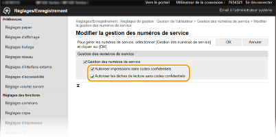 [Confirmer l'ID de service/PIN à l'impression]/[Confirmer l'ID de service/PIN lors de l'envoi de fax]