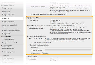 Bloque l'enregistrement dans des dossiers partagés et sur des serveurs FTP. L'option <Fichier>, dans la fonction de numérisation, ne peut pas être utilisée.