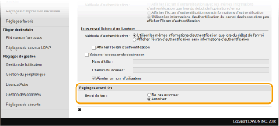 Bloque l'envoi d'e-mails et d'I-Fax. Les options <E-mail> et <I-Fax>, dans la fonction de numérisation, ne peuvent plus être utilisées.