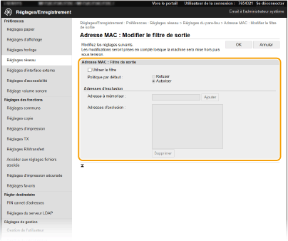 En cas de saisie incorrecte des adresses MAC, vous risquez de pas pouvoir accéder à l'appareil via l'interface utilisateur distante. Si cela se produit, réglez <Filtre d'adresse MAC> sur <Désact.>. <Filtre d'adresse MAC>