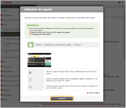 Lorsque vous cliquez sur l'icône, il peut arriver que la page affichée devienne noire et qu'une fenêtre contextuelle s'affiche. Pour revenir sur la page, cliquez sur [Fermer] dans la fenêtre contextuelle.