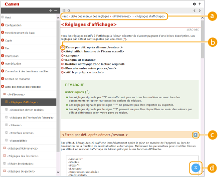 Cliquez ici pour configurer l'affichage du Guide de l'utilisateur, notamment la taille des caractères ou la structure des écrans.
