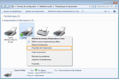 Effectuez un clic droit sur l'icône du pilote d'imprimante de cet appareil, puis cliquez sur [Propriétés de l'imprimante] ou [Propriétés].
