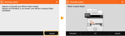Dans certains cas, lorsqu'une erreur se produit, les instructions permettant d'y remédier s'affichent. Suivez ces instructions pour corriger l'erreur. L'écran apparaissant en cas de bourrage papier est reproduit ci-après à titre d'exemple.