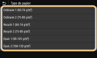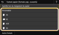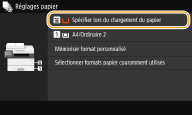 Une fois les paramètres papier par défaut enregistrés, l'écran de définition du papier ne s'affiche plus lorsque vous insérez du papier, et les mêmes paramètres sont appliqués systématiquement. Si vous chargez un papier de format ou de type différents sans modifier les paramètres papier, l'appareil risque de ne pas imprimer correctement. Pour éviter ce problème, sélectionnez <Spécifier lors du chargement du papier> à l'étape 3, puis chargez le papier.