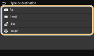 <Réglages des fonctions> <Envoyer> <Réglages fax>. Toutefois, les réglages effectués depuis <Carnet adr.> sont activés pour les paramètres détaillés des destinataires enregistrés dans le carnet d'adresses. |